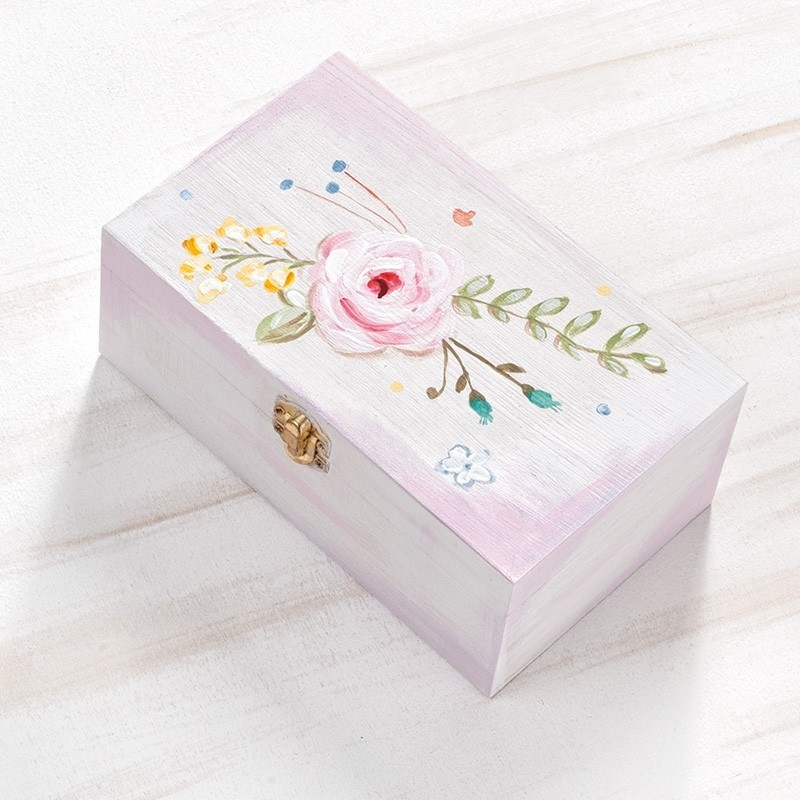 Ξύλινο λευκό κουτί μαρτυρικών,ζωγραφισμένο στο χέρι με πολύχρωμη σύνθεση λουλουδιών πάνω σε φόντο λευκό με ροζ σβησίματα.