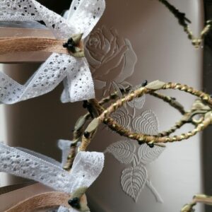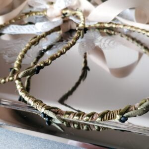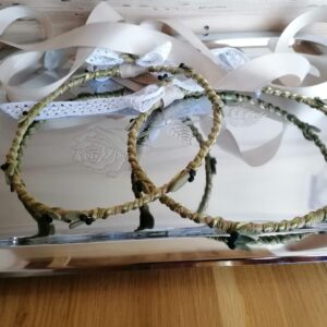 Η τιμή αφορά μόνο τα στέφανα. Συνοδεύονται με δύο μπουτονιέρες για γαμπρό και κουμπάρο , σε στεφανοθήκη.