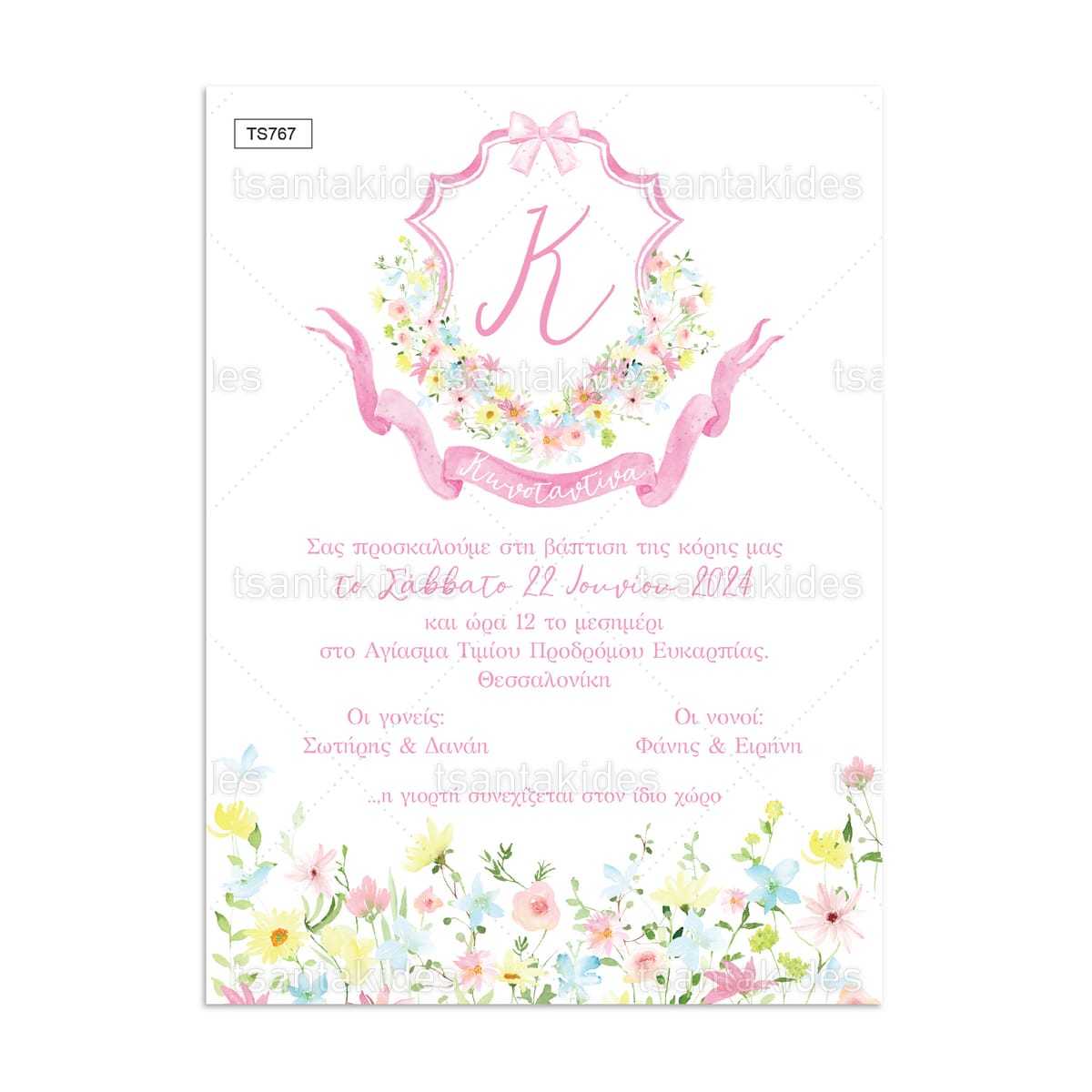πρόσκληση βάπτισης μονόγραμμα με λουλούδια