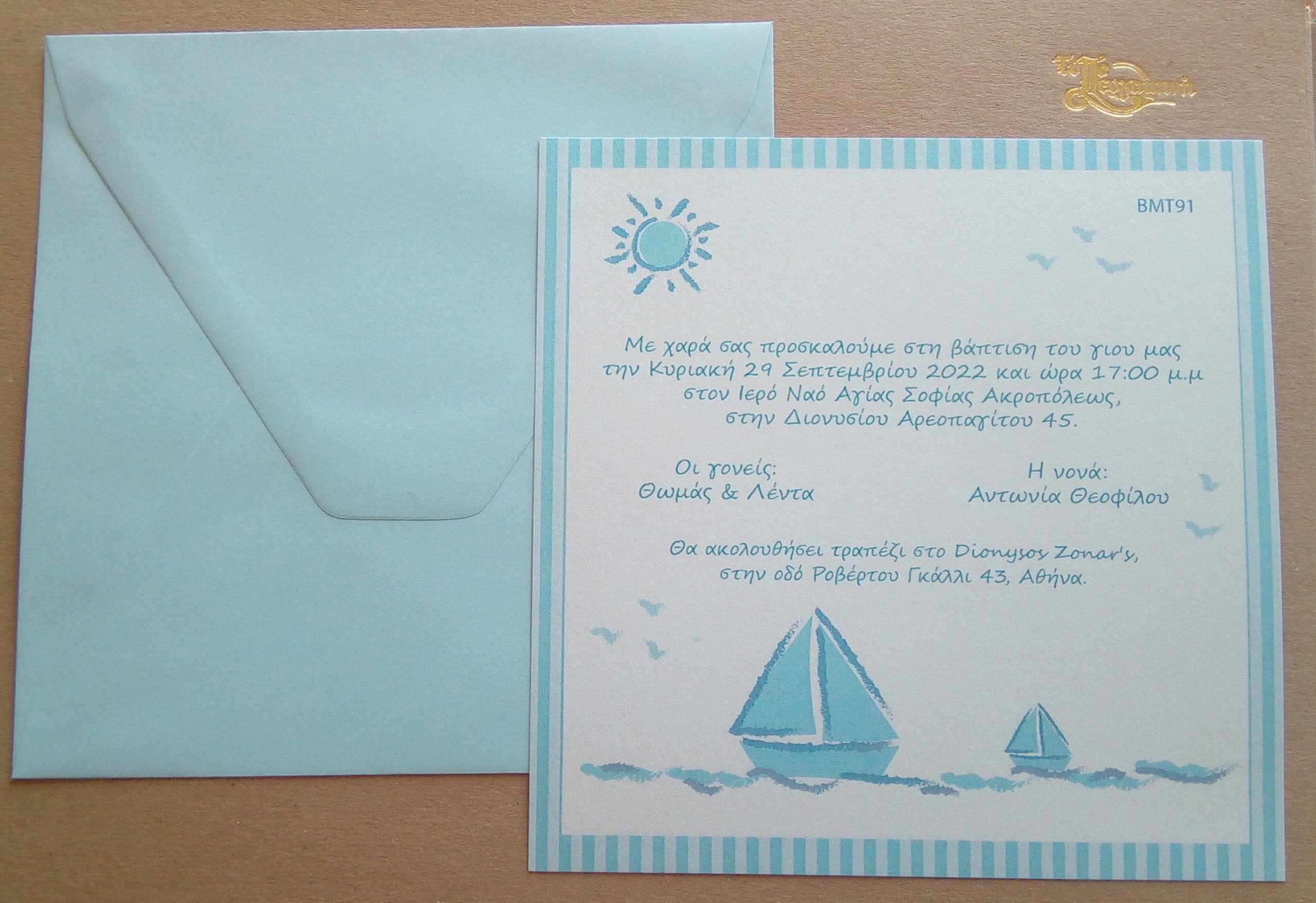 Πρόσκληση καραβάκι σε μεταλλιζέ χαρτί,με απλό σιέλ φάκελο,στην τιμή δεν συμπεριλαμβάνετε η εκτύπωση,είναι στην διάθεσή σας όλες οι επιλογές εκτύπωσης όπως και χρωματολόγιο.