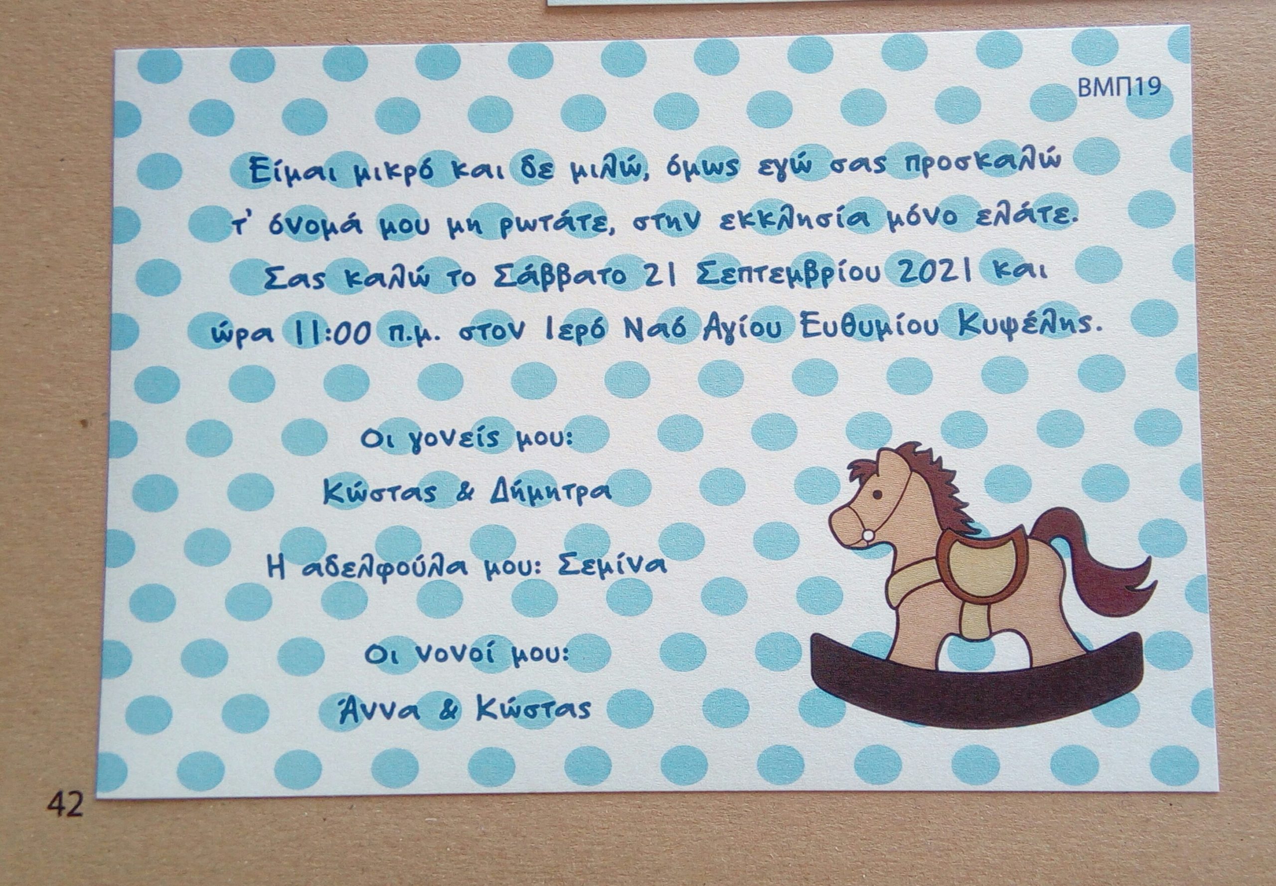 Πρόσκληση αλογάκι,με απλό σιέλ φάκελο,στην τιμή δεν συμπεριλαμβάνετε η εκτύπωση,είναι στην διάθεσή σας όλες οι επιλογές εκτύπωσης,όπως και χρωματολόγιο.