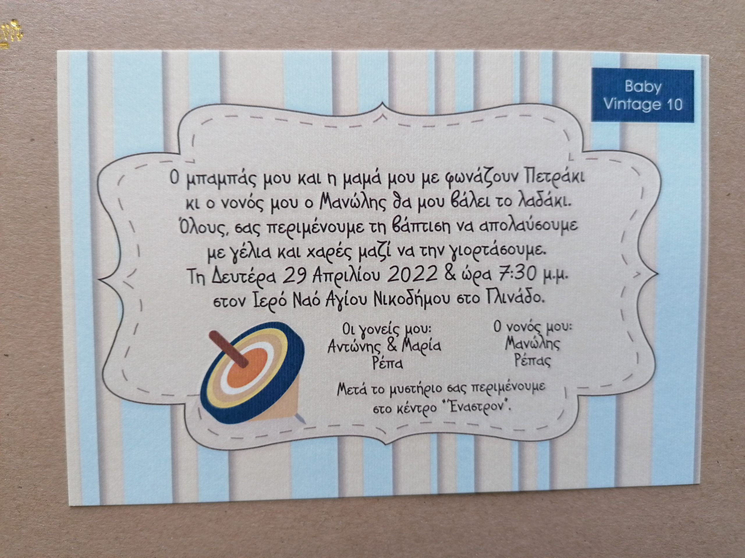 Πρόσκληση vintage ,με εκρού φάκελο,στην τιμή δεν συμπεριλαμβάνετε η εκτύπωση,είναι στην διάθεσή σας όλες οι επιλογές εκτύπωσης όπως και χρωματολόγιο.