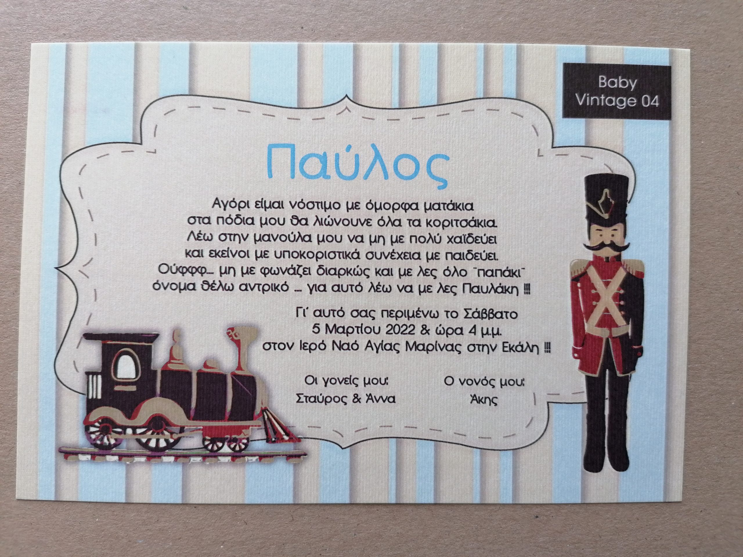 Πρόσκληση vintage τρενάκι,με εκρού φάκελο,στην τιμή δεν συμπεριλαμβάνετε η εκτύπωση,είναι στην διάθεσή σας όλες οι επιλογές εκτύπωσης όπως και χρωματολόγιο.