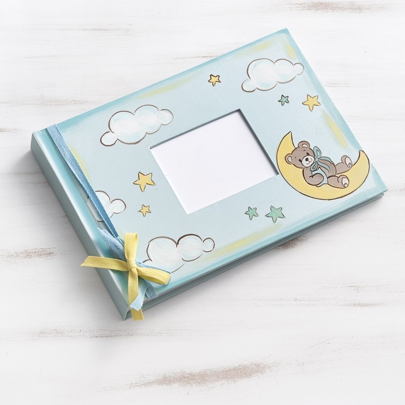 Βιβλίο ευχών λευκό με εξώφυλλο από χοντρό χαρτόνι, δεμένο με κορδέλα σιέλ και κίτρινη και ζωγραφισμένο στο χέρι με αρκουδάκι ξαπλωμένο πάνω σε φεγγαράκι,ανάμεσα σε σύννεφα και αστεράκια με σβησίματα σιέλ-κίτρινα
