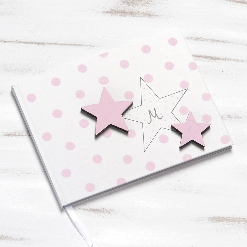 Βιβλίο ευχών λευκό εξωτερικά από χοντρό χαρτόνι ζωγραφισμένο στο χέρι με αστέρι πουά ροζ πάνω σε φόντο πουά ροζ και διακοσμημένο με ξύλινα αστεράκια ροζ