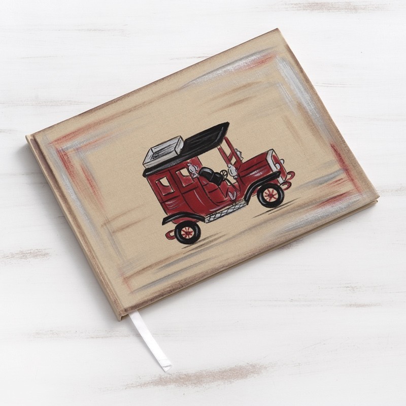 Βιβλίο ευχών λευκό εξωτερικά από χοντρό χαρτόνι, ζωγραφισμένο στο χέρι με αυτοκίνητο αντίκα κόκκινο και σβησίματα καφέ-γκρι-κόκκινα πάνω σε φόντο μπεζ