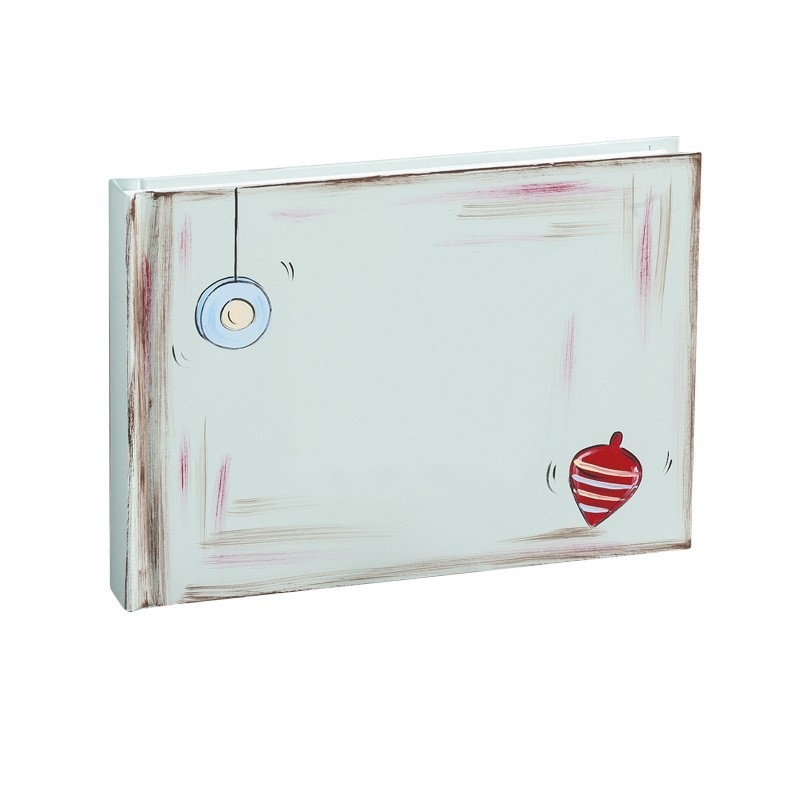 Βιβλίο ευχών λευκό εξωτερικά από χοντρό χαρτόνι, ζωγραφισμένο στο χέρι με παιδικά παιχνίδια σε φόντο σιέλ με σβησίματα καφέ-κόκκινα