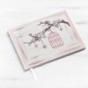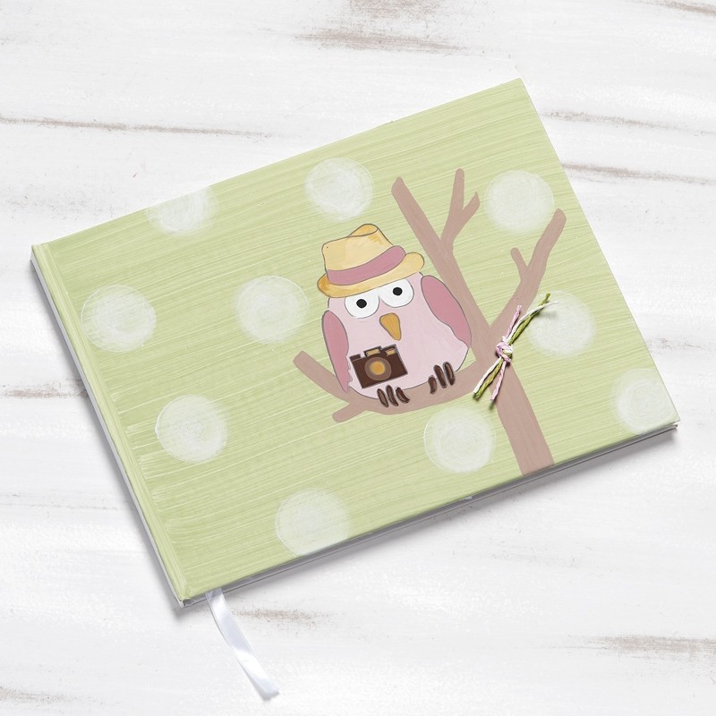 Βιβλίο ευχών λευκό εξωτερικά από χοντρό χαρτόνι, ζωγραφισμένο στο χέρι με κουκουβάγια ροζ να κάθεται πάνω σε ένα δέντρο σε φόντο βεραμάν πουά