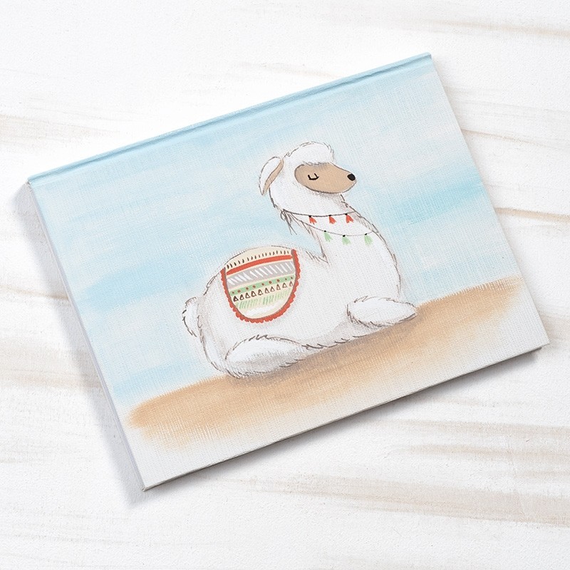 Βιβλίο ευχών λευκό, εξωτερικά από χοντρό χαρτόνι,ζωγραφισμένο στο χέρι με θέμα το λάμα σε λευκές-σιέλ-καφέ αποχρώσεις.