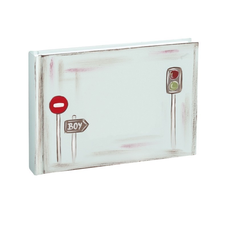 Βιβλίο ευχών λευκό εξωτερικά από χοντρό χαρτόνι, ζωγραφισμένο στο χέρι με σήματα οδικής κυκλοφορίας σε φόντο σιέλ με σβησίματα καφέ-κοκκινα