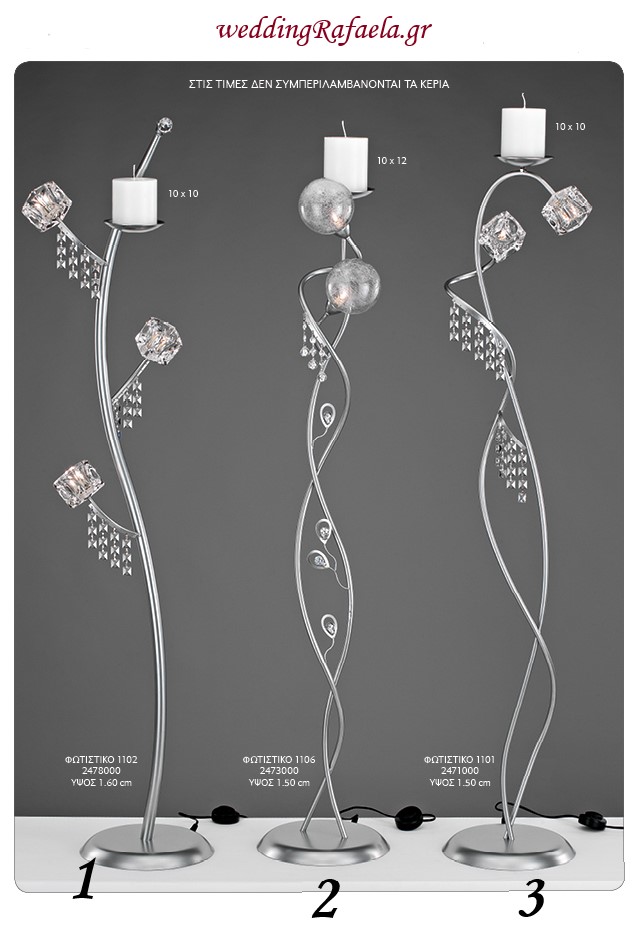 Φωτιστικά δαπέδου εντυπωσιακά με κρυσταλλάκια ή χωρίς θα κάνουν την όμορφη ημέρα της ζωής ακόμα πιο λαμπερή,η εμφάνιση τους δίνουν μία άλλη εικόνα στο γάμο σας.Επιλέξτε απο τα πανέμορφα σχέδια μας σε ότι απόχρωση επιθυμείτε,το μόνο που έχετε να κάνετε είναι να μας το ζητήσετε,είμαστε εδώ με προθυμία να σας εξυπηρετήσουμε για κάθε απορία σας.