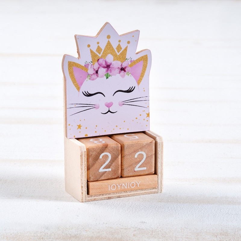 Ξύλινο ημερολόγιο με κύβους σε natural χρώμα. Διακοσμημένο με κοπτικό Γάτα.