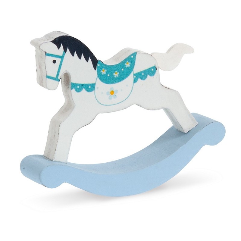 Ξύλινο διακοσμητικό 3D κουνιστό αλογάκι σε λευκό χρώμα με λεπτομέρειες σιέλ.