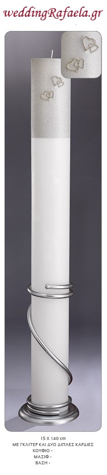 Λαμπάδα με γκλίτερ και δύο διπλές καρδιές,με βάση. Διαστάσεις 15χ140 εκ.