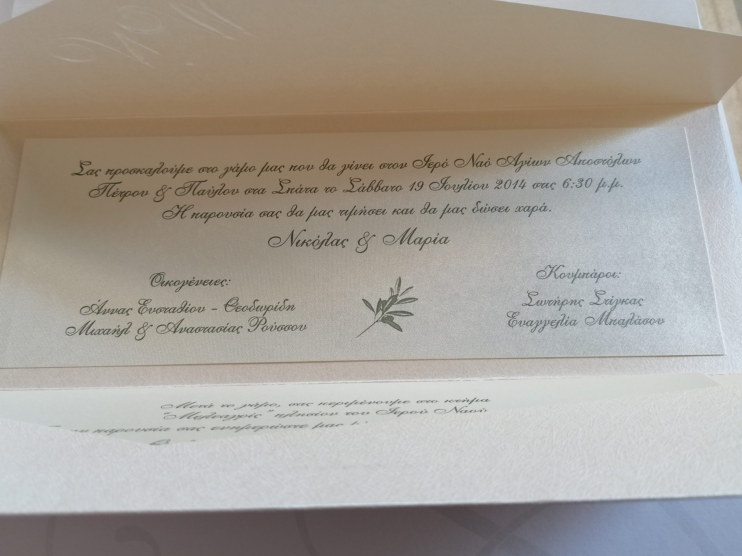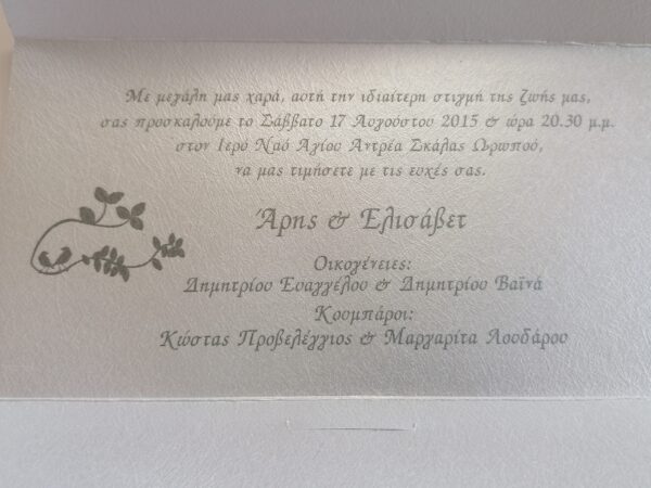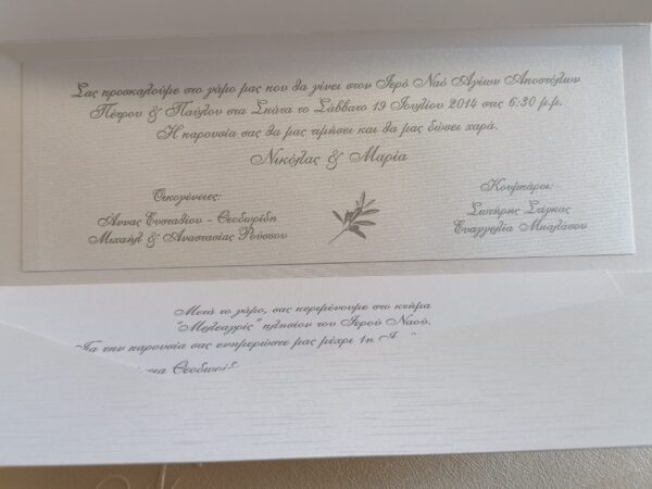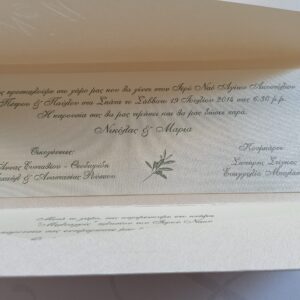 Όλες οι προσκλήσεις μας δεν συμπεριλαμβάνουν την τιμή τις εκτύπωσης,διαφοροποιείται η τιμή με την επιλογή του πελάτη,υπάρχουν όλες οι επιλογές εκτύπωσης.Όλες οι προσκλήσεις γάμου κατασκευάζονται με χαρτιά πολυτελείας.Η τιμή αφορά το ένα τεμάχιο πρόσκλησης με τον φάκελο.Για περισσότερες πληροφορίες παρακαλώ μην διστάσετε να επικοινωνήσετε μαζί μας.